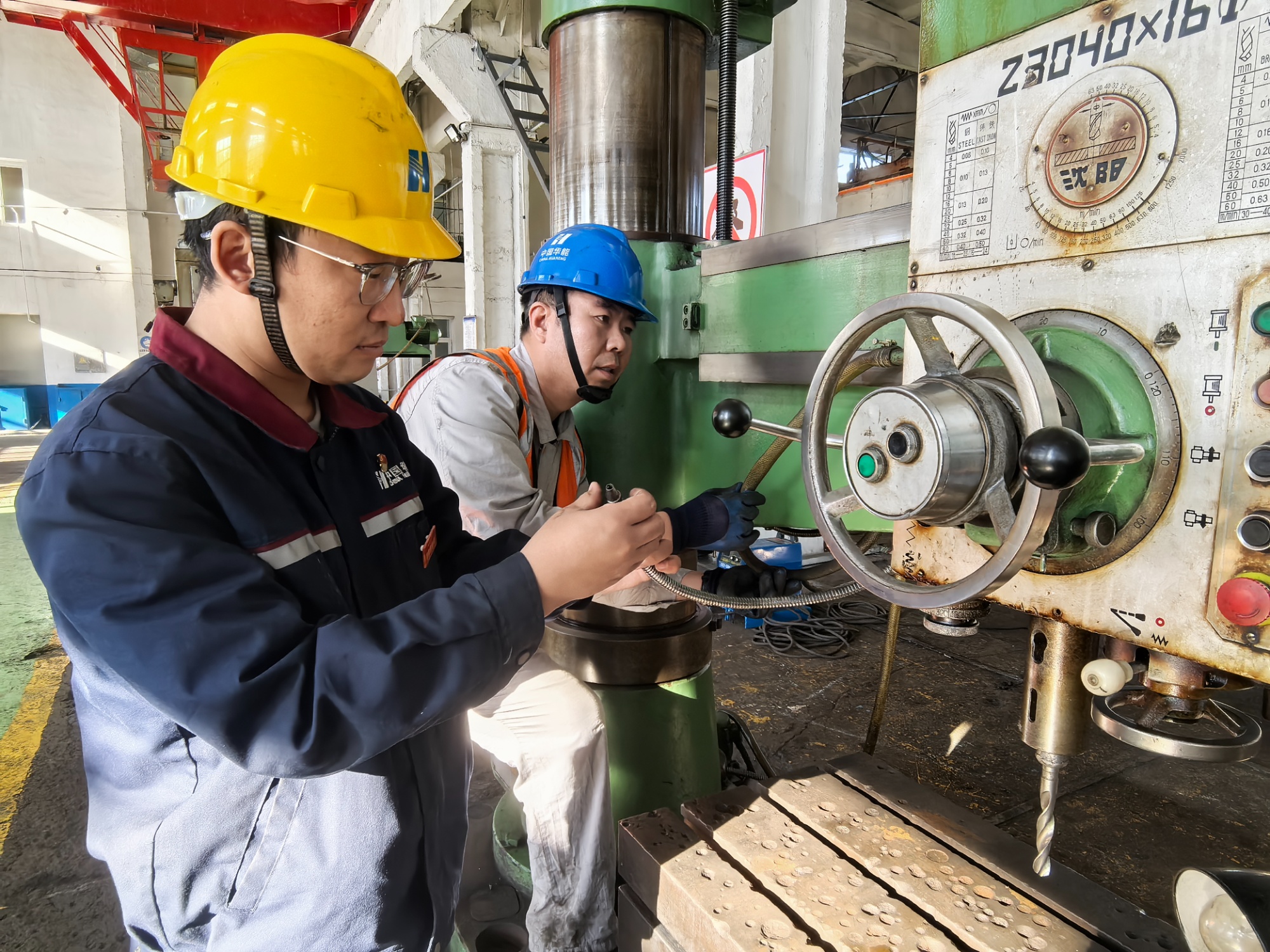 机电总厂综机车间技术员和班组长查看车间现场Z3040摇臂钻床(隋晓亮 摄)
